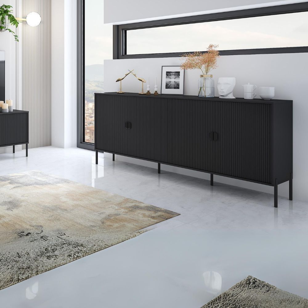 Articolo: Madia Lotus 4 Ante Nera Opaco Cannettate Con Piedini E Maniglie Nere